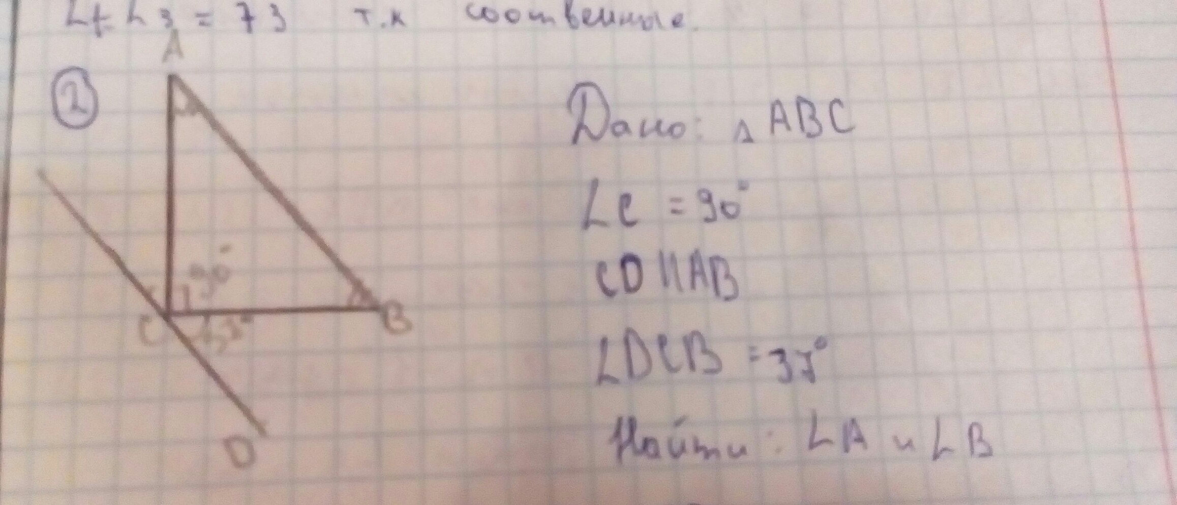 так как в прямоугольном треугольнике углы, прилежащие к гипотенузе, в сумме дают 90°, угол A=90°-37°=53°