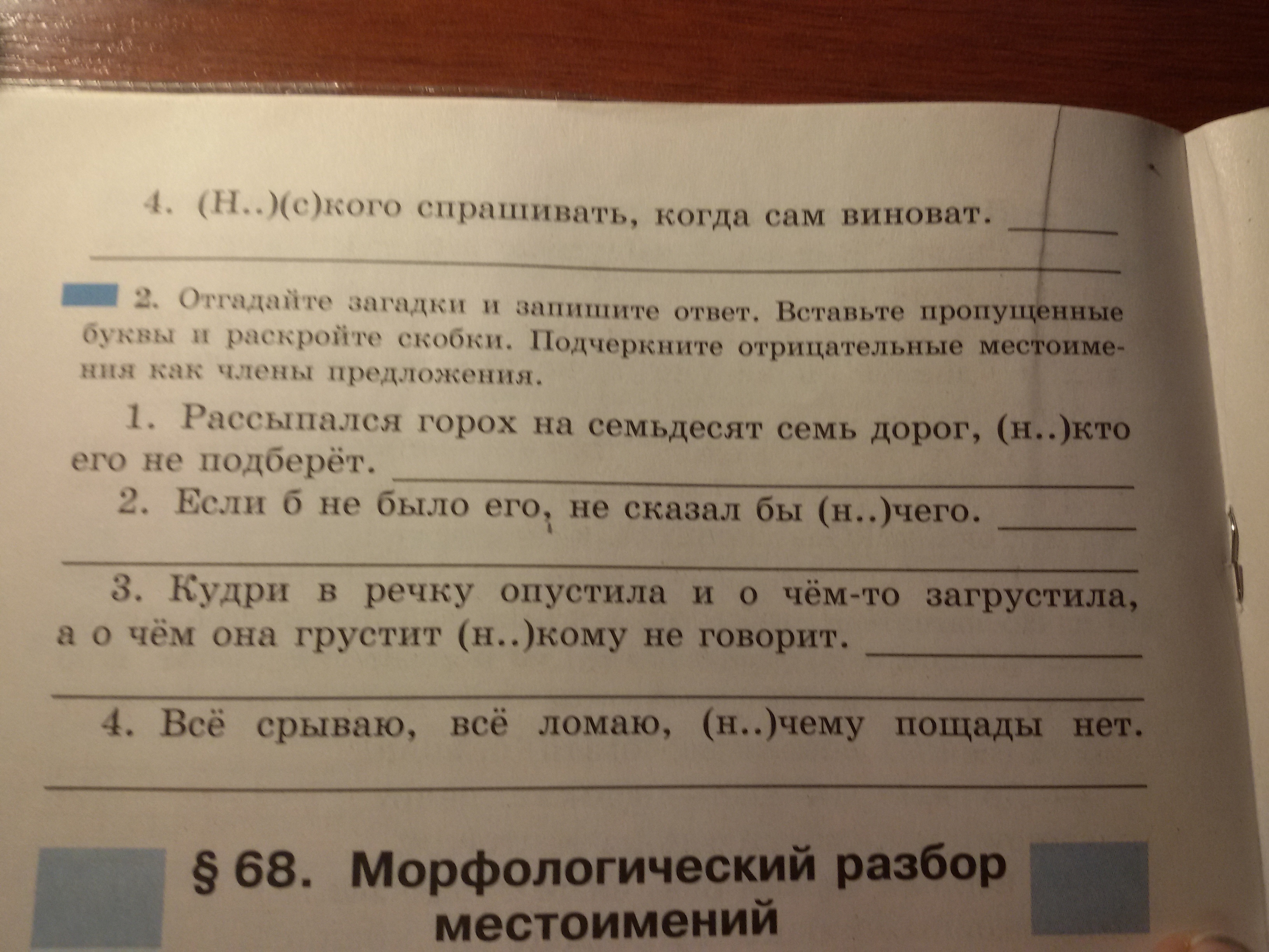 номер 2 пожалуйста надо вставить пропущенные буквы, ответить на зашадки и подчеркнуть местоимения как члены предложения
