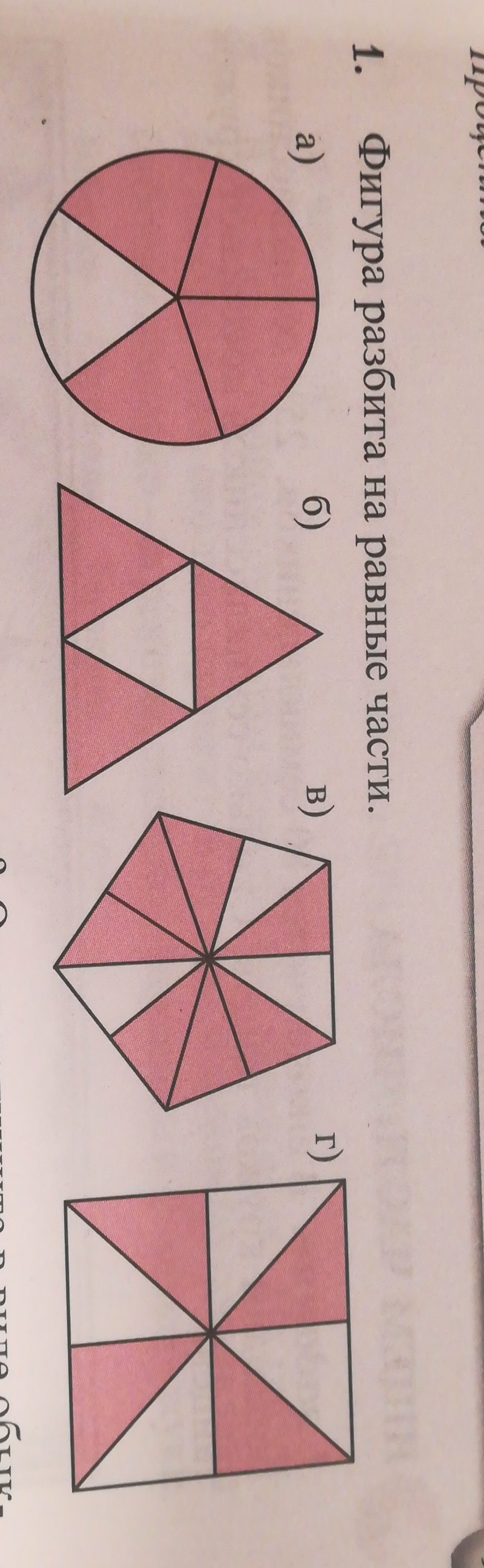 1я фигура разбита на 5 частей. Не закрашена 1/5 то есть 20% фигуры. 2я разбита на 4 части то есть не закрашена 1/4 это 25%. 3я фигура разбита на 20 частей. 3/10 не закрашено.это 30%. 4я фигура разбита на 8 частей не закрашено 4/8 это 50%