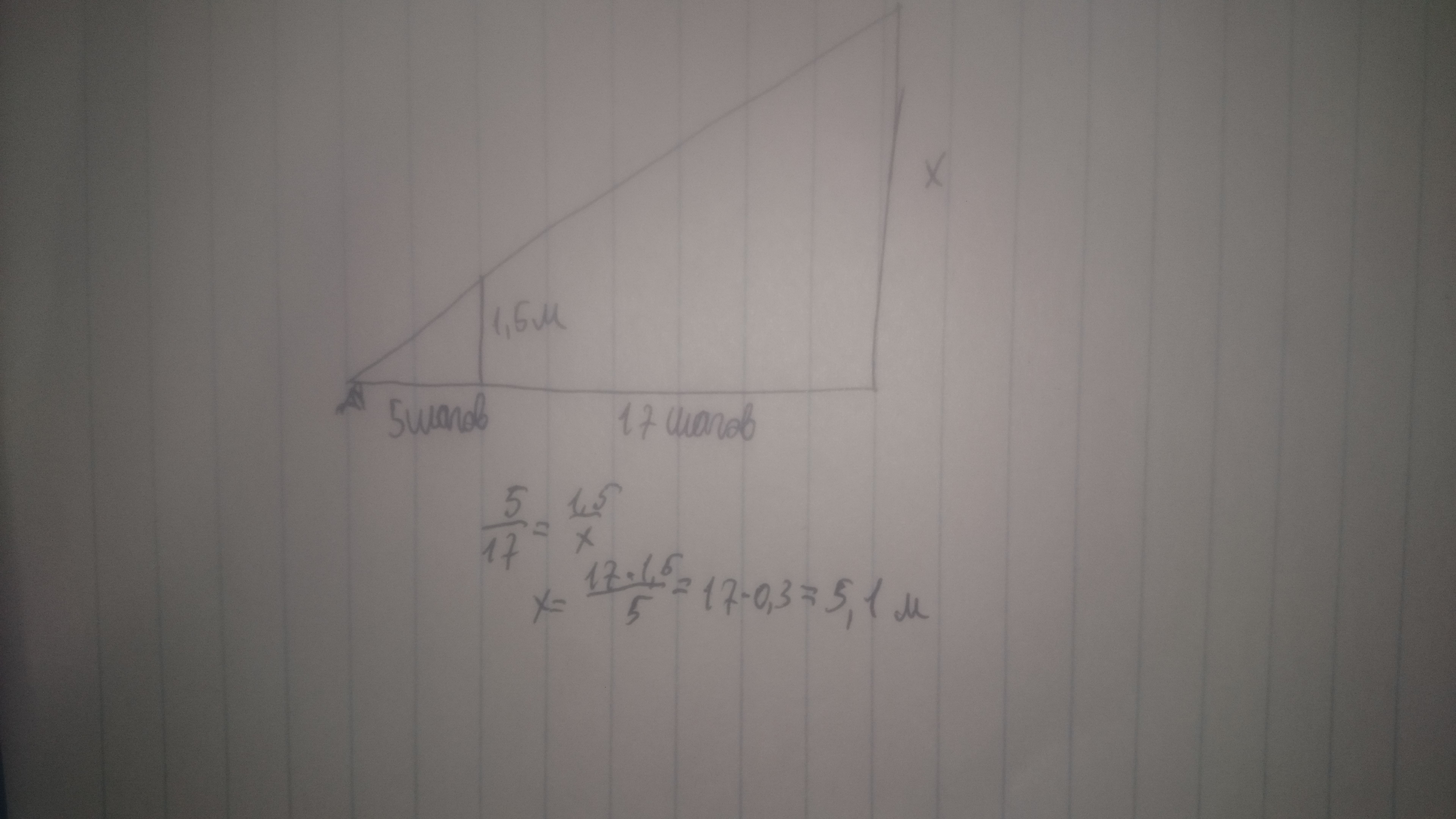 Человек ростом 1,5 м стоит на расстоянии 17 шагов от столба, на котором висит фонарь. Тень человека равна пяти шагам. На какой высоте ( в метрах) расположен фонарь?