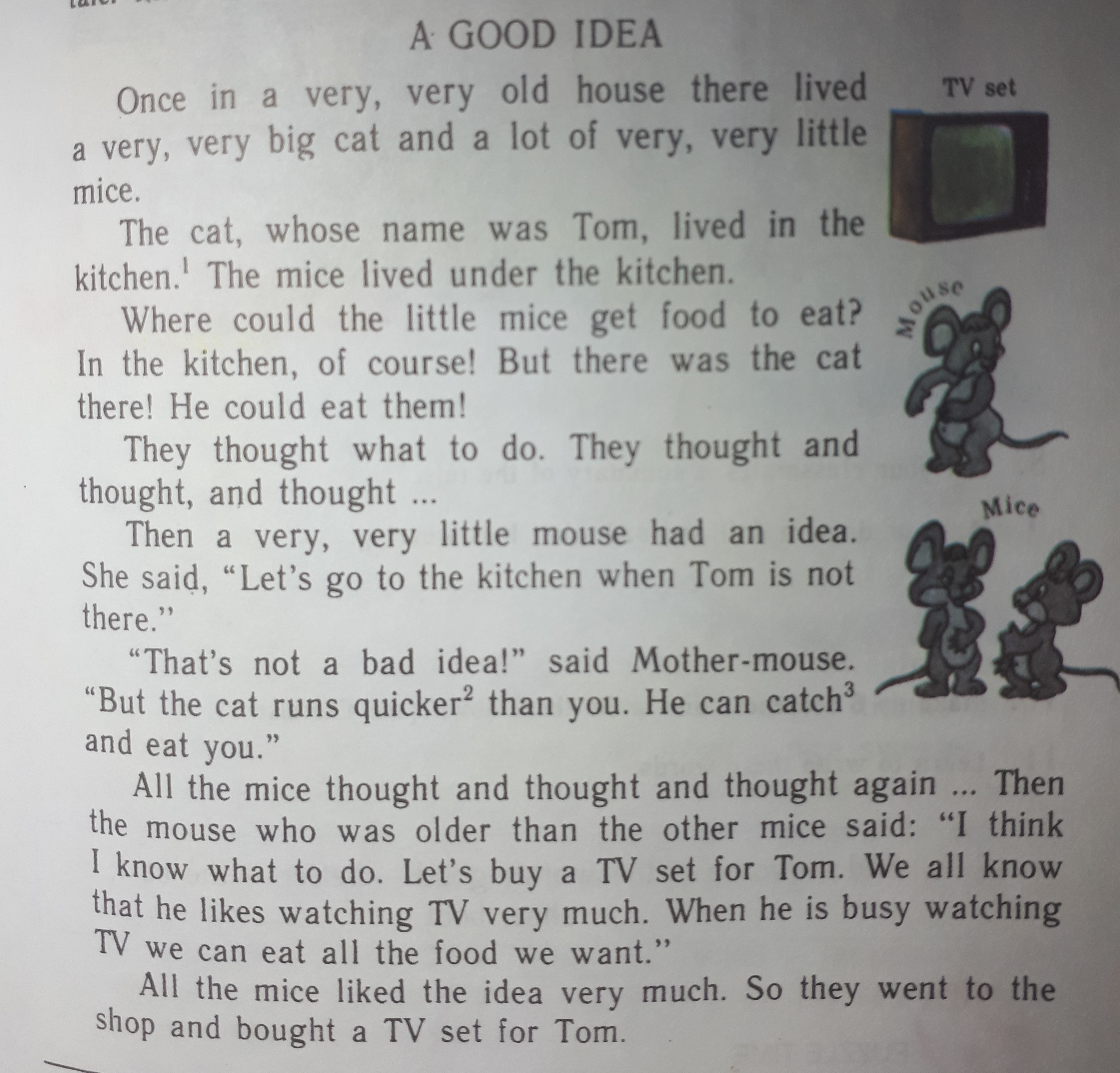Однажды, в очень очень старом доме жили очень очень большой кот и очень очень маленькие мышки. Кот по имени Том жил на кухне. Мыши жили под кухней. Откуда маленькие мыши должны были брать еду? На кухне, конечно же! Но там был кот! Он мог их съесть! Они думали, что же делать. Они думали, думали и думали... Затем, у очень очень маленькой мышки появилась идея. Она сказала: «давайте пойдем на кухню, когда Тома там не будет!» «Это неплохая идея!» - сказала мама-мышка. «Но кот бегает быстрее тебя, он может поймать тебя и съесть!» Все мыши думали, думали и думали снова... Затем, самая старая мышка сказала: «Я знаю что делать. Давайте купим телевизор для Тома. Мы все знаем, что он очень любит смотреть телевизор. Пока он будет занят просмотром телевизора, мы можем съесть всю еду, какую захотим». Всем мышкам понравилась эта идея. Поэтому они пошли в магазин и купили телевизор для Тома.