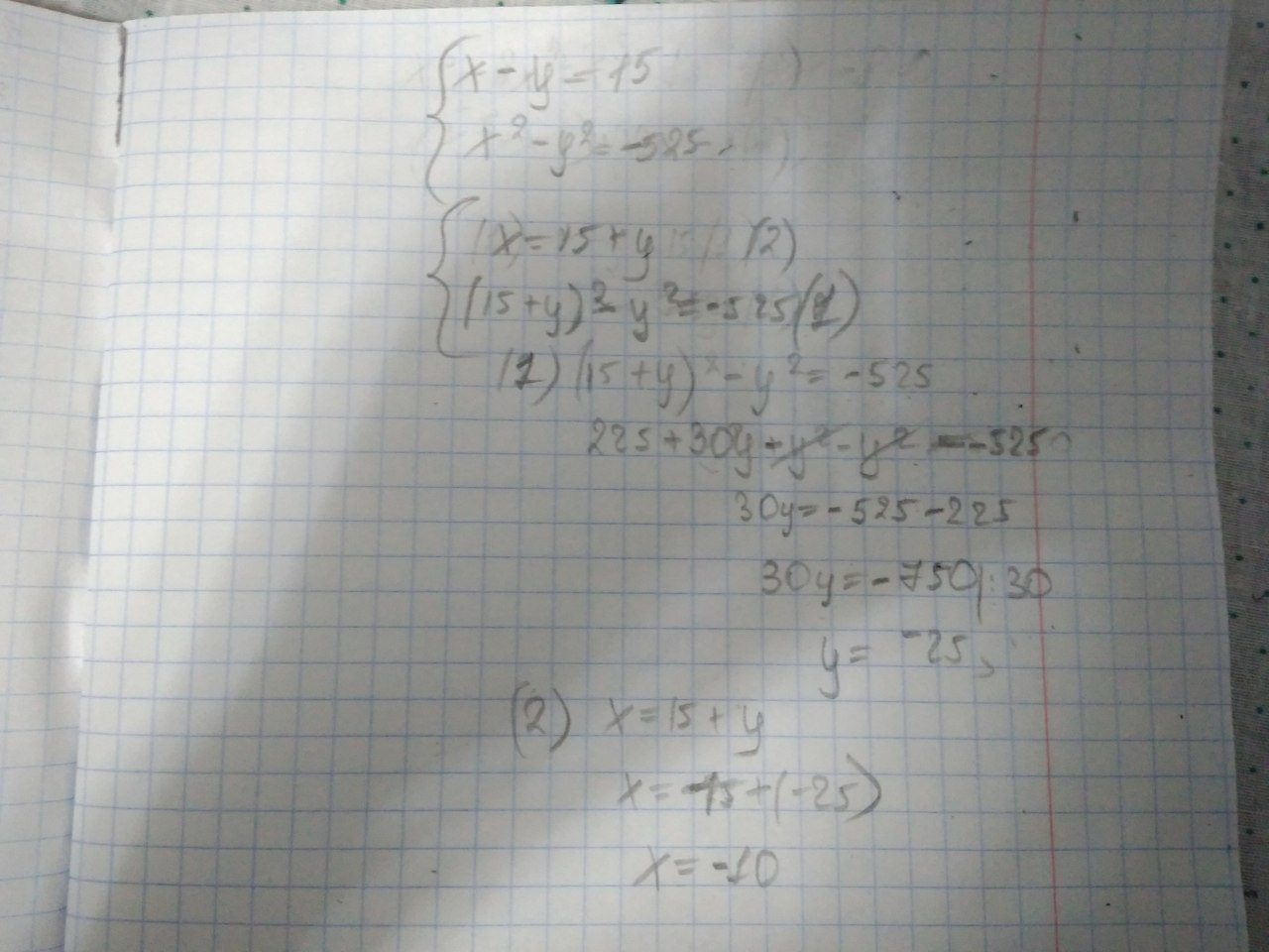 Решите задачу при помощи составления уравнения : Разность двух чисел 15,а разность их квадратов -525