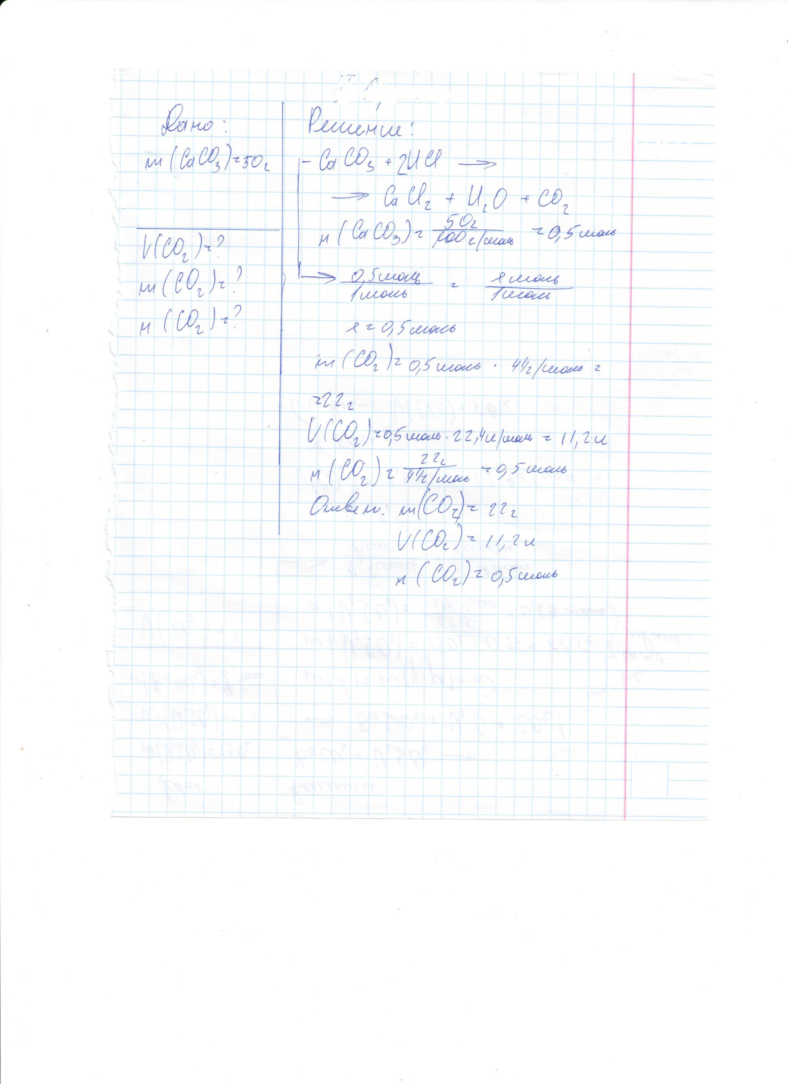 Вычислите количество вещества, массу и объем углекислого газа, получился при взаимодействии 50 г карбоната кальция избытком раствора соляной кислоты