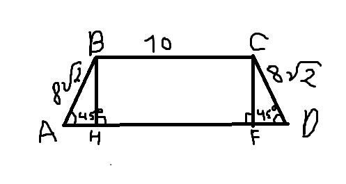 Площадь трапеции равна половине произведения ее оснований на высоту.Проведем высоты BH и СF, HBCF - прямоугольник ⇒ HF=BC = 10 см