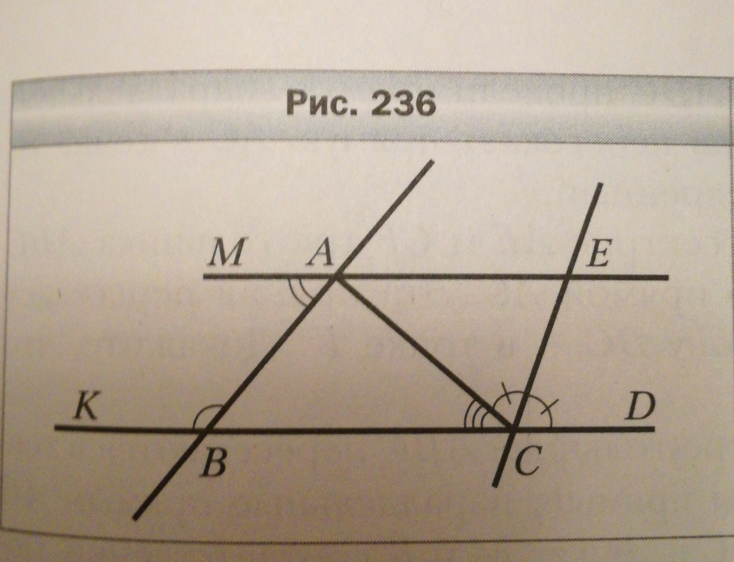 На рисунке 236 угол MAB = 50°, угол ABK = 130°, угол ACB = 40°, CE - биссектриса угла ACD. Найдите углы треугольника ACE