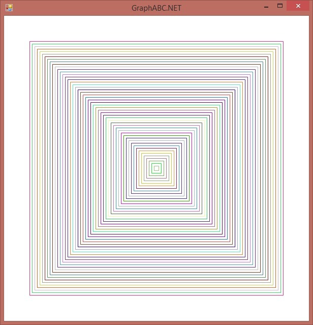 Написать программу которая будет выводить на экран 50 концентрических квадратов с центром в середине экрана (по размеру в смысле 1,2,3 и до 50) в pascalABC.net