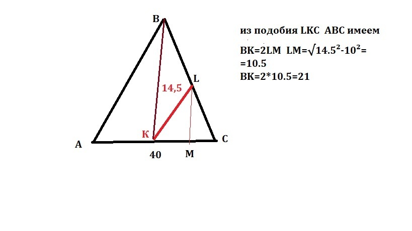 В равнобедренном треугольнике ABC основание AC=40.Расстояние между серединами основания и боковой стороны равно 14,5.Найдите высоту ВK,проведённую к основанию AC