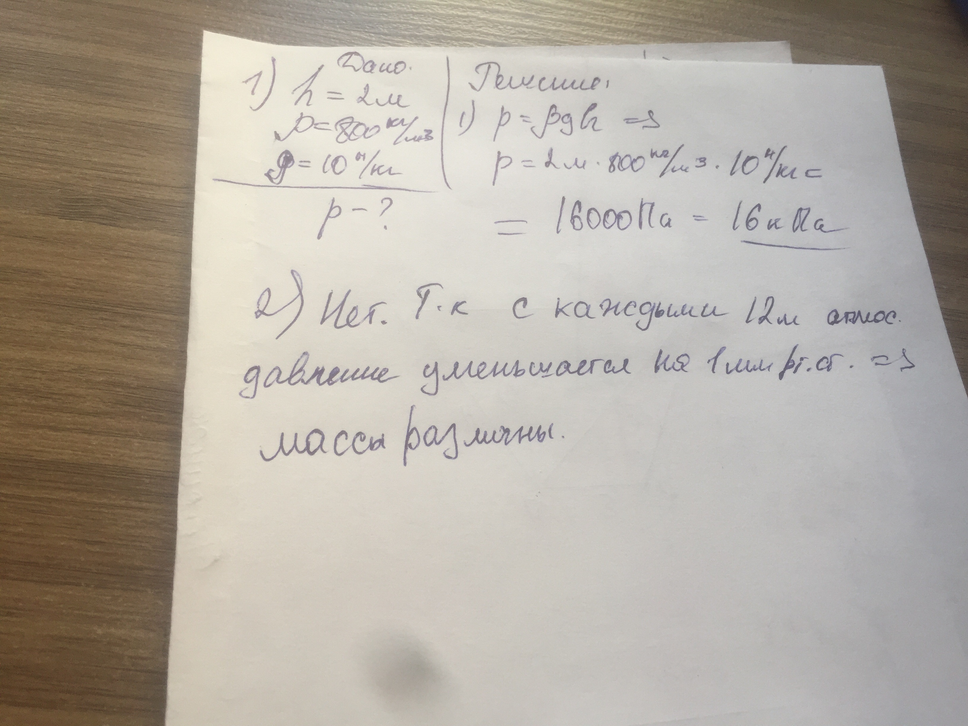 1)Определите давление керосина на дно и боковую стенку сосуда, если высота керосина в сосуде 2 м. Плотность керосина 800 кг/м3.
