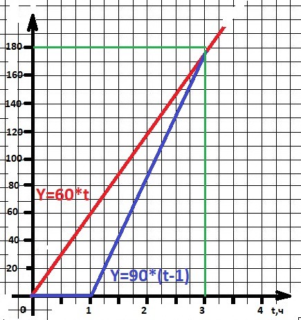 Y = 90*(t-1) = 90*t - 90 - путь второго.