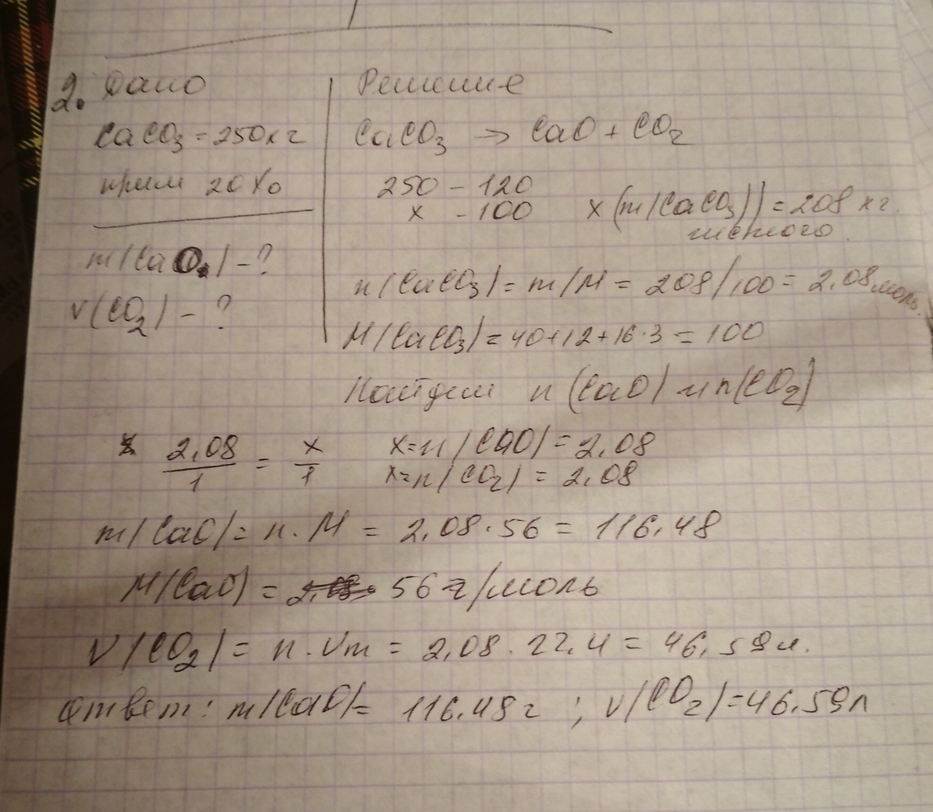 2. Какая масса оксида кальция получится при разложении 250 кг карбоната кальция, содержащего 20 % примесей? Какой объем (н.у.) оксида углерода (IV) при этом выделится?