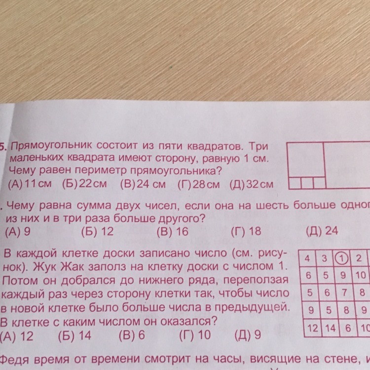 Прямоугольник состоит из пяти квадратов. Три маленьких квадрата имеет сторону равна 1 см. Чему равен периметр прямоугольника?