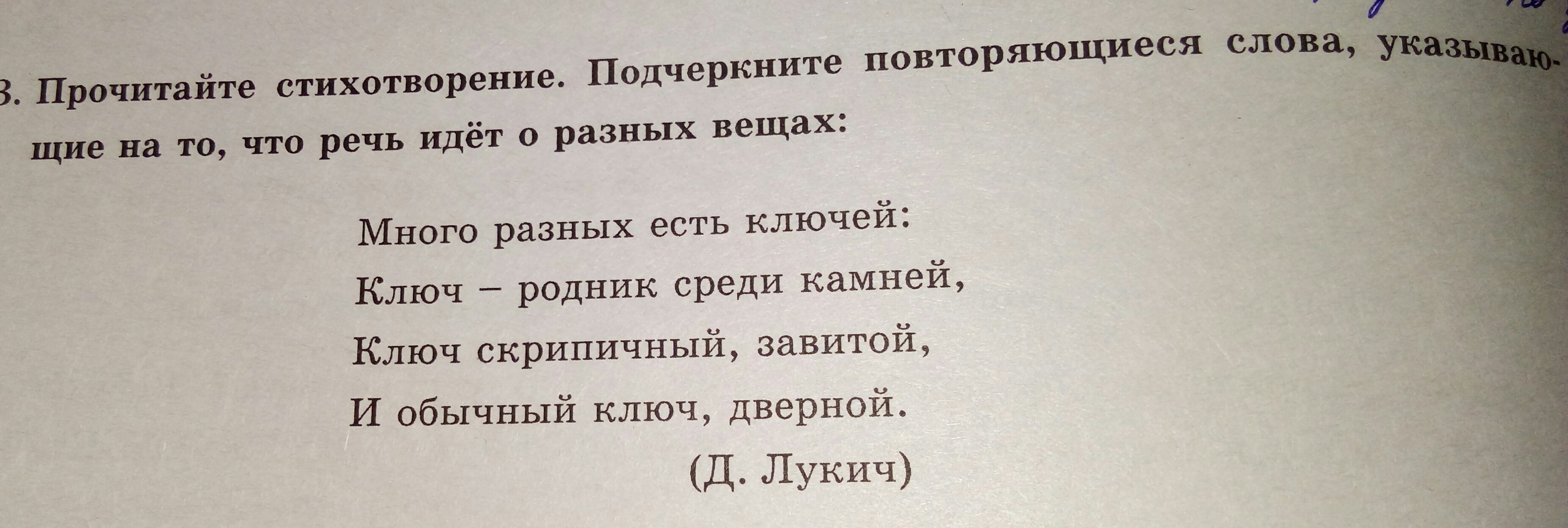 прочитай стихотворение Подчеркните повторяющиеся слова указывающие на то что речь идёт о разных вещах. много разных есть ключей ключ родник среди камней ключ скрипичный завитой и обычный ключ дверной