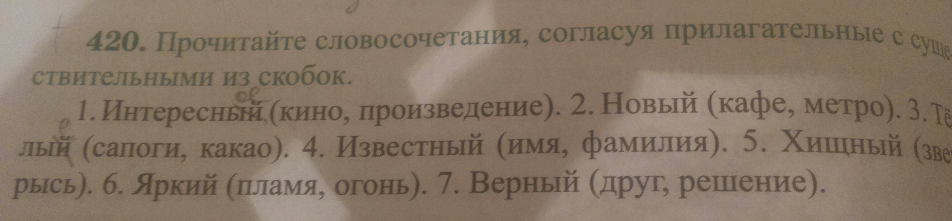Интересное кино, интересное произведение. 2) новое кафе, новое метро.3) тёплые сапоги, тёплое какао. 4)известное имя, известная фамилия. 5) хищная рысь. 6) яркое пламя, яркий огонь. 7) верный друг, верное решение