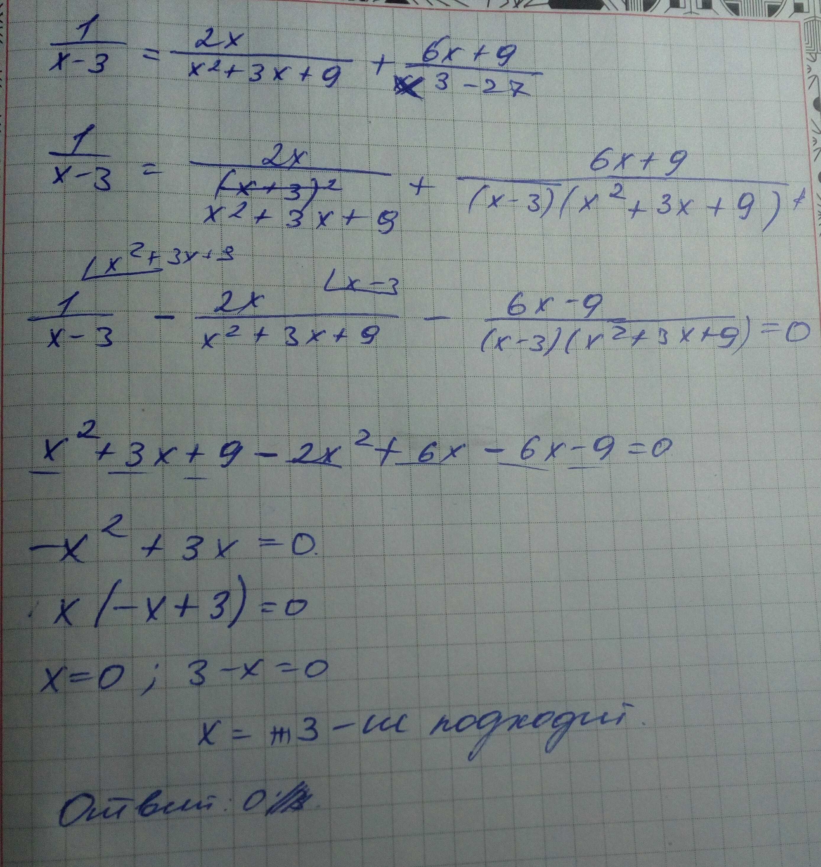 x^{2}+3x+9=2x(x-3)+6x+9 <=>(равносильно) x^{2}-3x=2x^{2}-6x <=> x^2-3x=0 <=> x(x-3)=0. Следовательно x=0 или x=3. Т.к. второй корень не входит в ОДЗ => Ответ: 0.