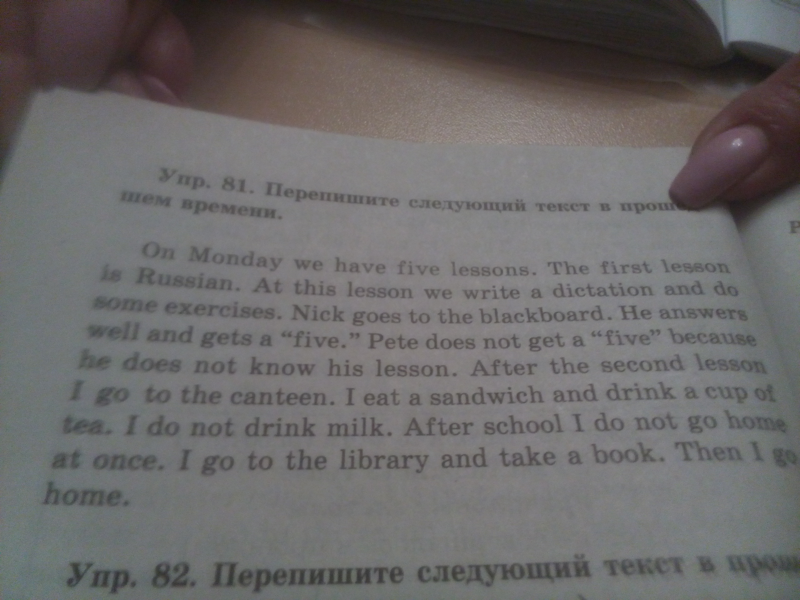on Monday we had five lessons. The first was Russian. At lesson we wrote a dictation and did some excercises. Nick went to the blackboard. He answered well and got five. Pete didonot get five because he did not know his lesson. After the second lesson i went to canteen. I ate sandwich and drank a cup of tea. I did not drink milk. After school did not go home at once. I went to the library and took a book. Then i went home.
