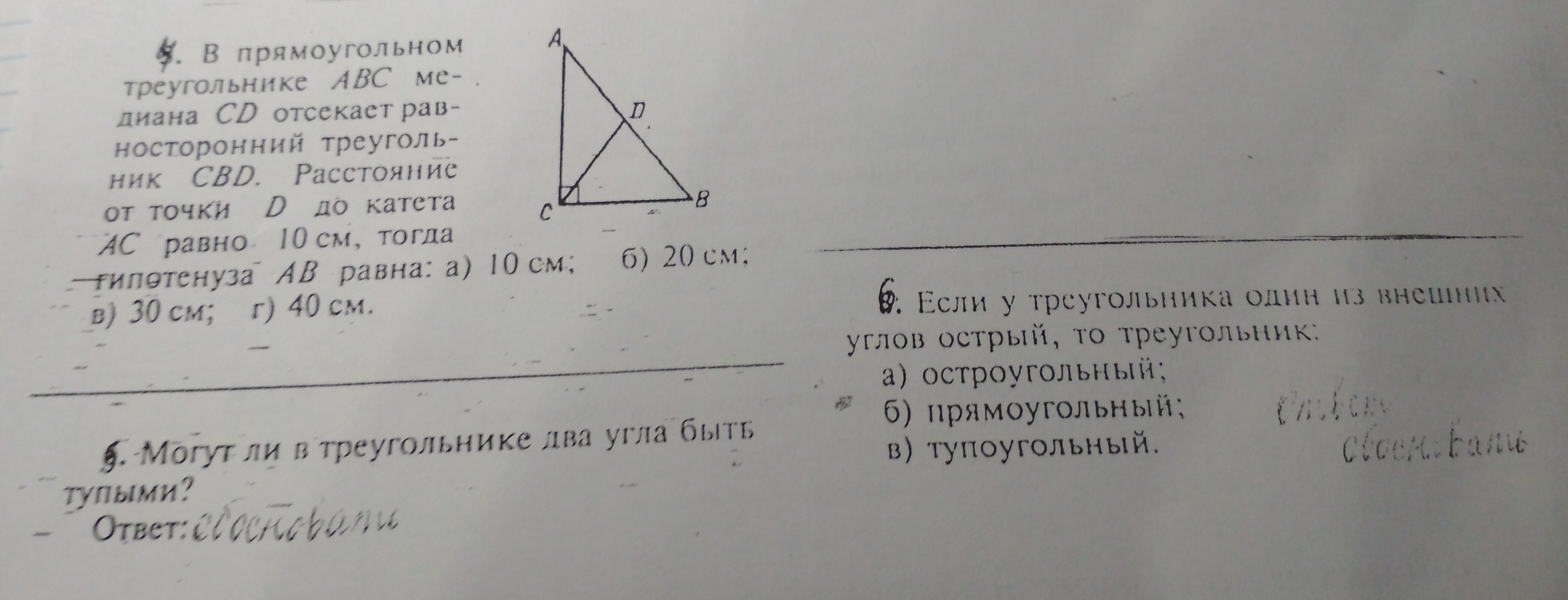 6) Ответ в - тупоугольный, потому что внешний угол - это смежный угол с одним их внутренних углов. А если внешний угол острый, то смежный с ним будет тупым. То есть один из углов треугольника будет тупым, что означает, что этот треугольник - тупоугольный.