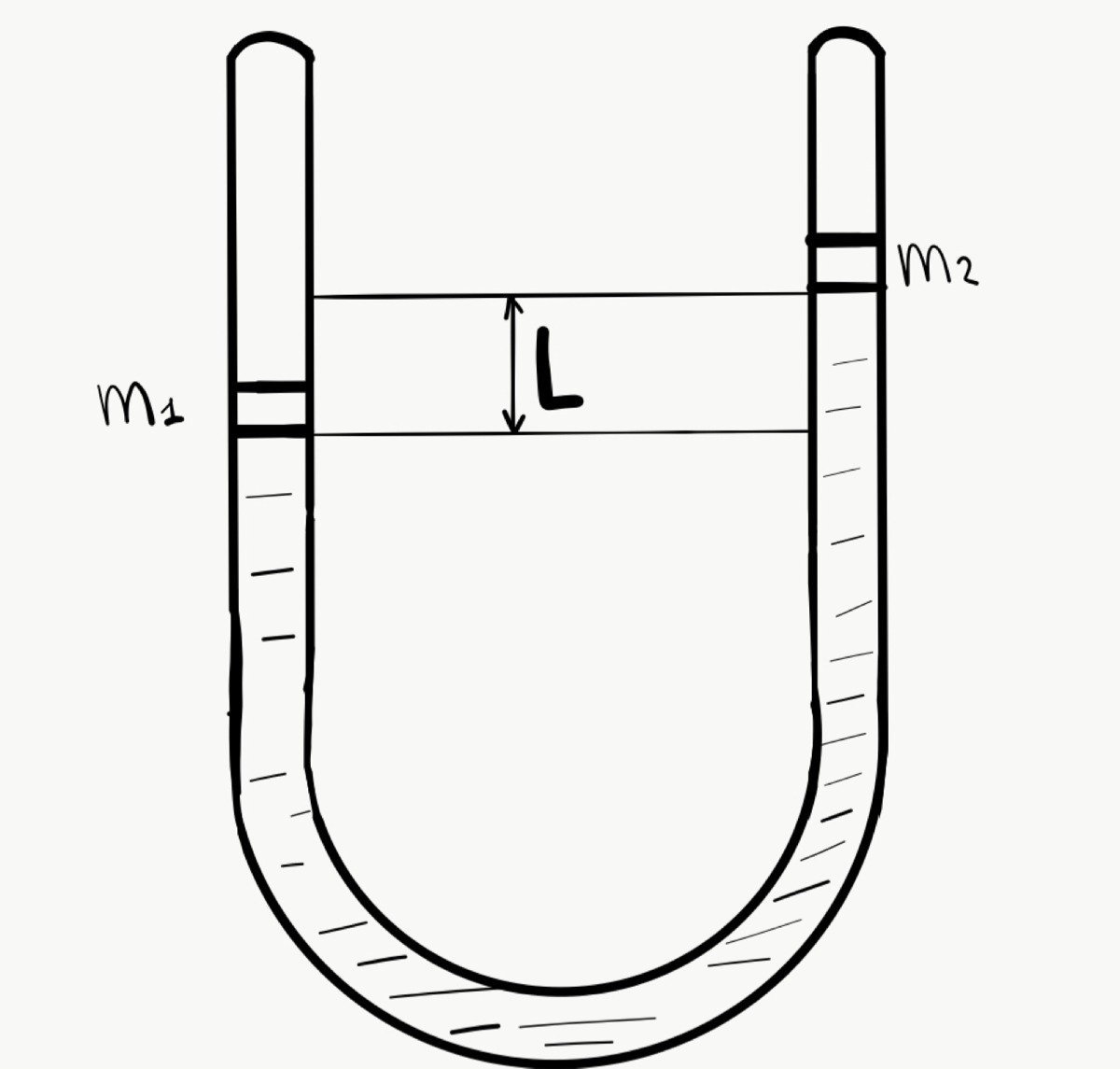 в запаянную с обоих концов вертикально расположенную U-образную однородную трубку с внутренним поперечным сечением S налита жидкость плотности р и вставлены два поршня, которые плотно прилегают к стенкам и могут скользить вдоль них без трения. Масса левого поршня-m1, правого-m2. Над поршнями-вакуум. Определить установившуюся разность уровней жидкостей L в коленах трубки.