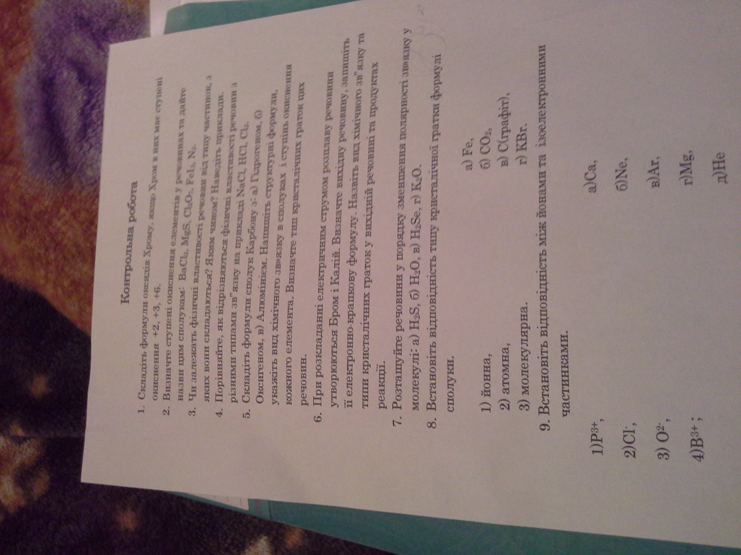 4. Йонний хімічний звязок (йонну кристалічну гратку) має кухонна сіль - натрій хлорид. Тому, ця речовина має значну твердість, нелетка, розчинна у воді, значна температура кипіння і плавлення. Хлор має між атомами в молекулі ковалентний неполярний звязок(молекулярна кристаллічна гратка)- низькі температура кипіння, газоподібна речовина, має запах, отруйна, розчиняється в хлороформі, бензені, зі збільшенням температури зменьшується розчинність її у воді. НСІ - має ковалентний полярний звязок і молекулярну кристалічну структуру. Речовина газоподібна(хлороводень), має невелику твердість, летка, легкоплавка