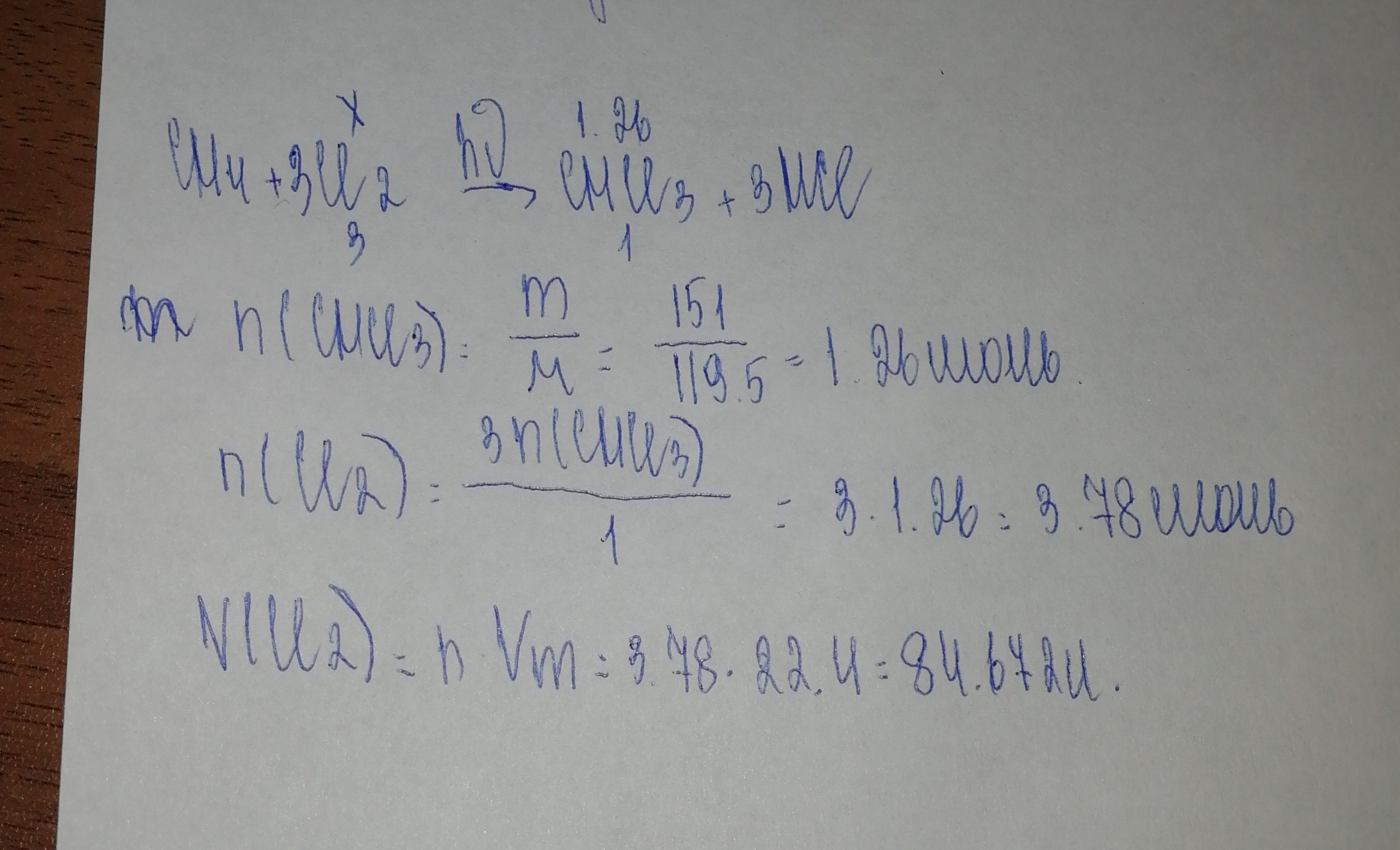 Пожалуйста, Определите объем (н.у.) хлора, необходимый для получения 151 г трихлорметана из метана