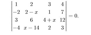 ![\left[\begin{array}{cccc}1&2&3&4\\-2&2-x&1&7\\3&6&4+x&12\\-6&-12&3&10\end{array}\right] \left[\begin{array}{cccc}1&2&3&4\\-2&2-x&1&7\\3&6&4+x&12\\-6&-12&3&10\end{array}\right]](https://tex.z-dn.net/?f=++%5Cleft%5B%5Cbegin%7Barray%7D%7Bcccc%7D1%26amp%3B2%26amp%3B3%26amp%3B4%5C%5C-2%26amp%3B2-x%26amp%3B1%26amp%3B7%5C%5C3%26amp%3B6%26amp%3B4%2Bx%26amp%3B12%5C%5C-6%26amp%3B-12%26amp%3B3%26amp%3B10%5Cend%7Barray%7D%5Cright%5D+)