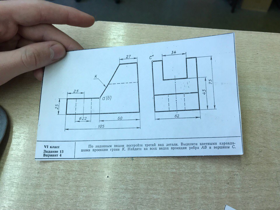 По заданным видам постройте третий вид детали.Выделите цветным карандашами проекции грани K