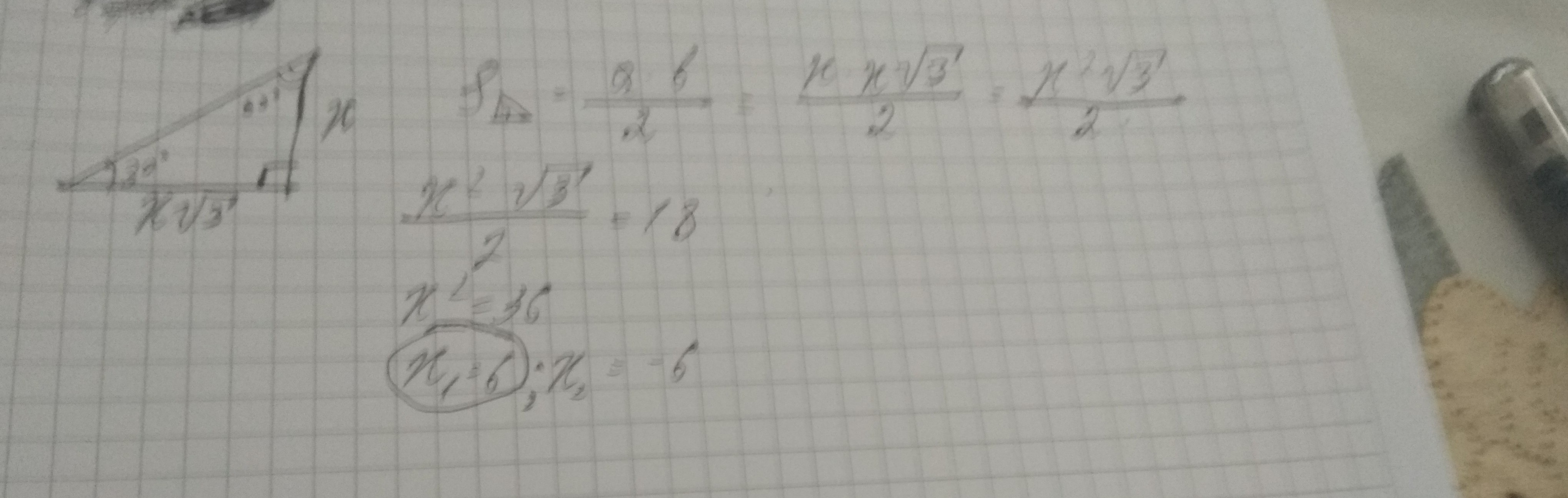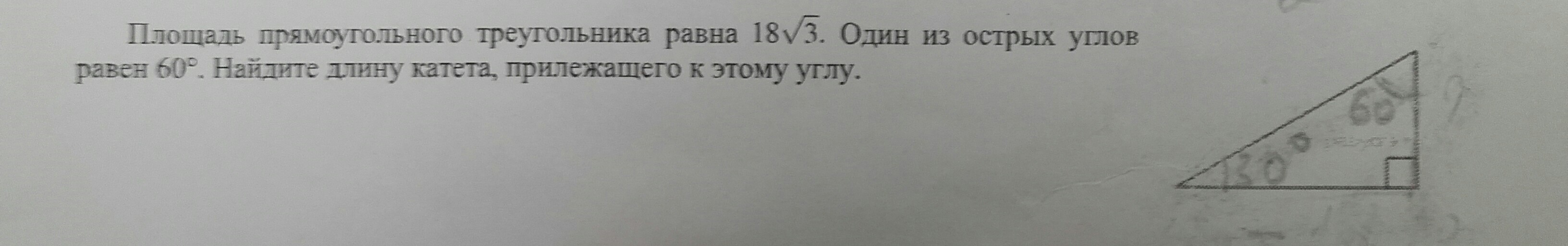 Площадь прямоугольного треугольника равен 18 корней из 3 . Один из острых углов равен 60 градусов. Найдете длину катета , прилежащего к этому углу .