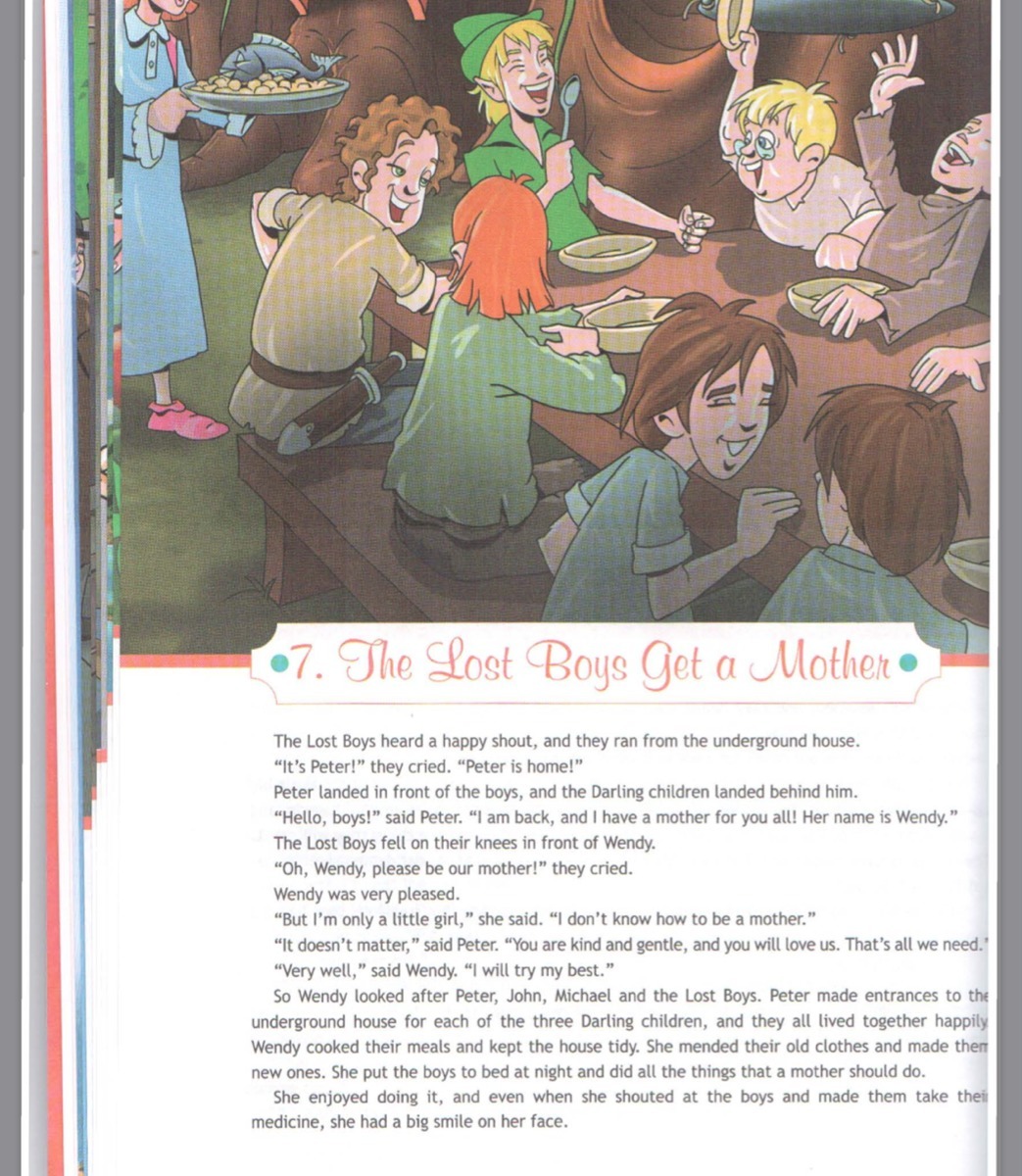Так Венди присматривала за Питером, Джоном, Майклом и на ПМ. Питер сделал вход в дом для детей Дарлингов, и они жили вместе. Венди готовила им обеды и сохраняла дом в чистоте. Она переделала старую одежду и сшила новую. Она укладывала детей спать и делала все, что должна делать мама.