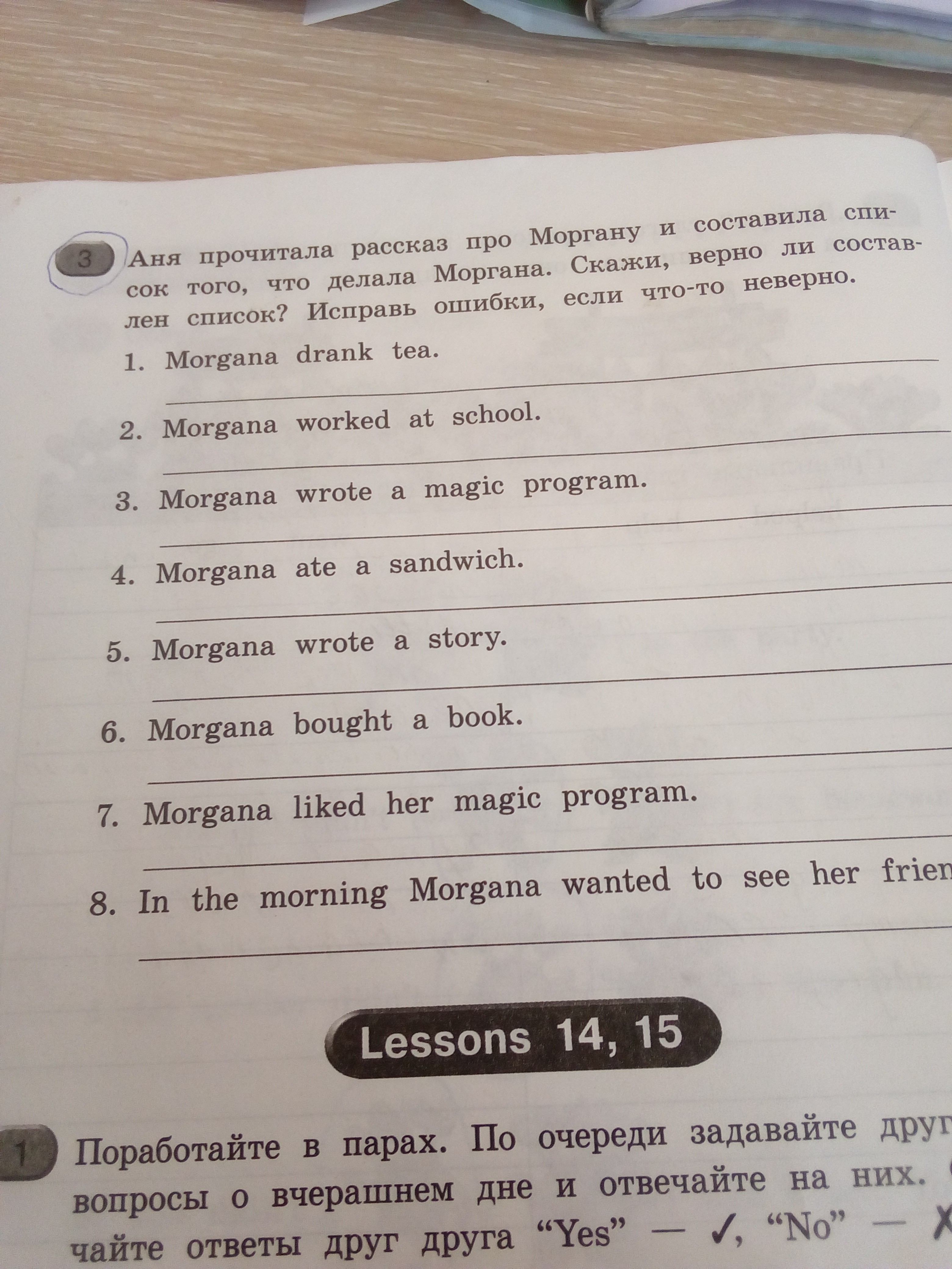 1.Morgana drink tea.4.Morgana eat a sandwich.5.Morgana write a story.