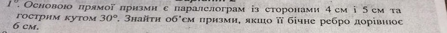 В основе призмы параллелограм АВСD. по условию ∠А=30°, АВ=4 см, АD=5 см.