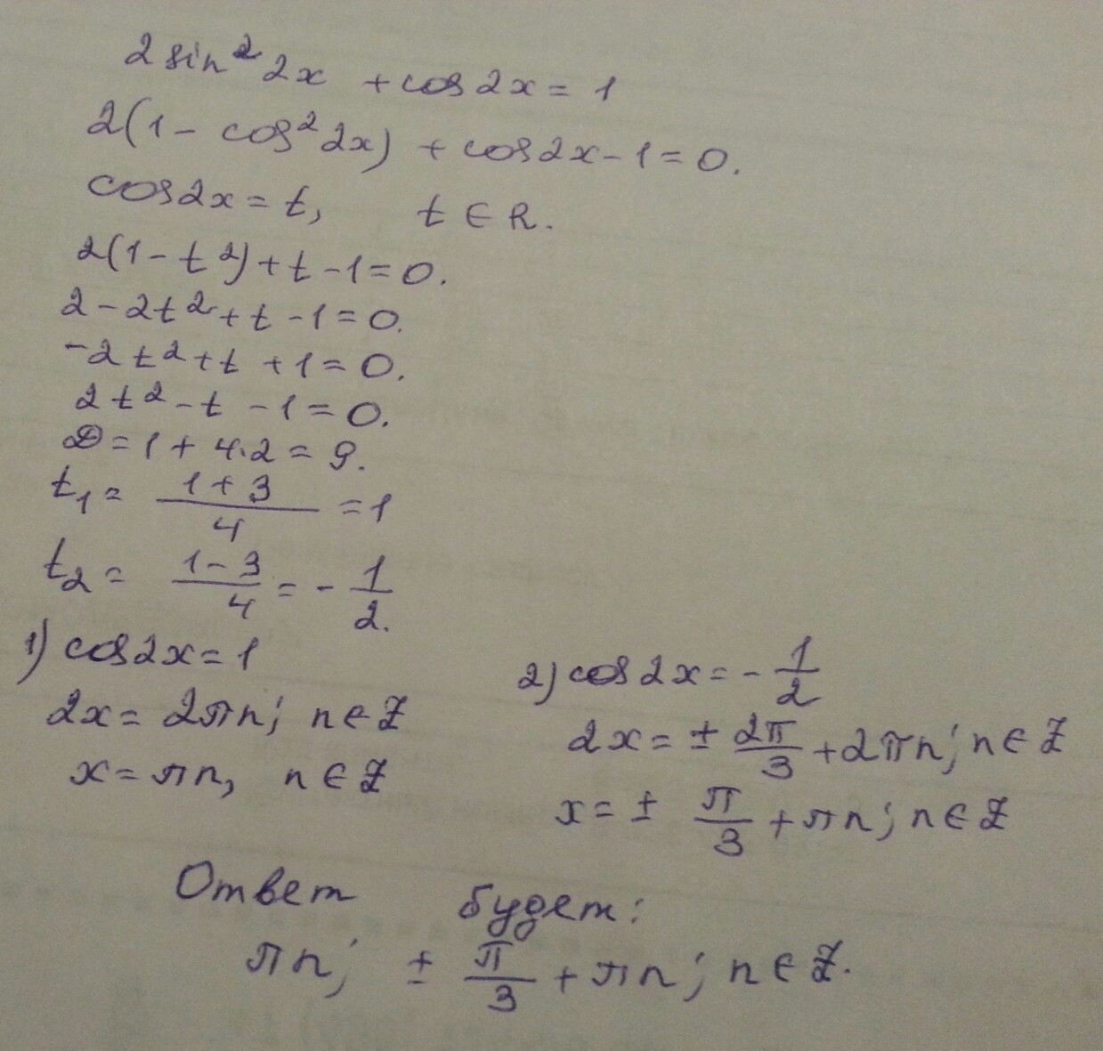 б) cos2x = -1/2⇒2x =±2π/3+2πl ,l ∈ ℕ ⇔ x₂,₃ =±π/3+πl, l ∈ ℕ .