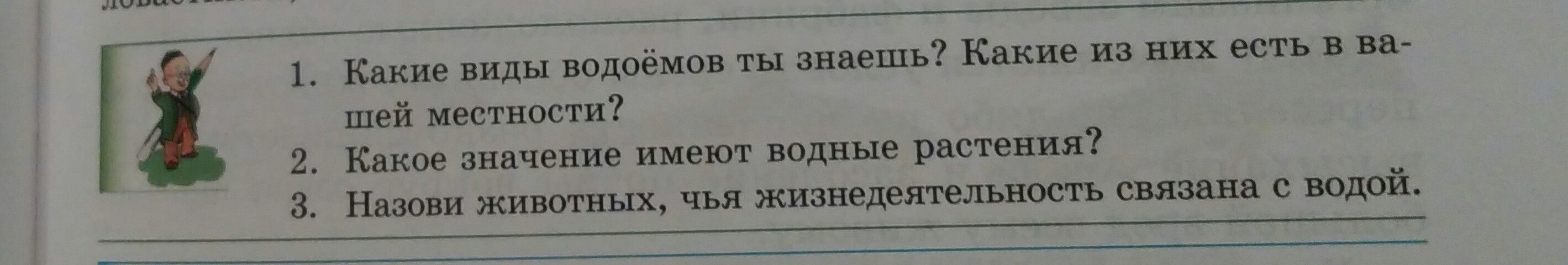 1. Болота, реки, озера, пруды. 2. Некоторые водные растения фильтруют воду. 3. Рыбы, лягушки, тритоны