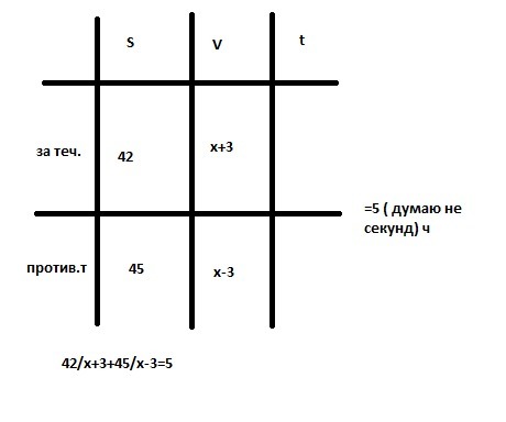 Моторная лодка прошла по течению реки 42км а затем 45 км против течения ,затратив на весь путь 5 с. Найдите скорость лодки в стоячей воде,если скорость течения реки равна 3 км/ч. Решите,пожалуйста, с подробным решением