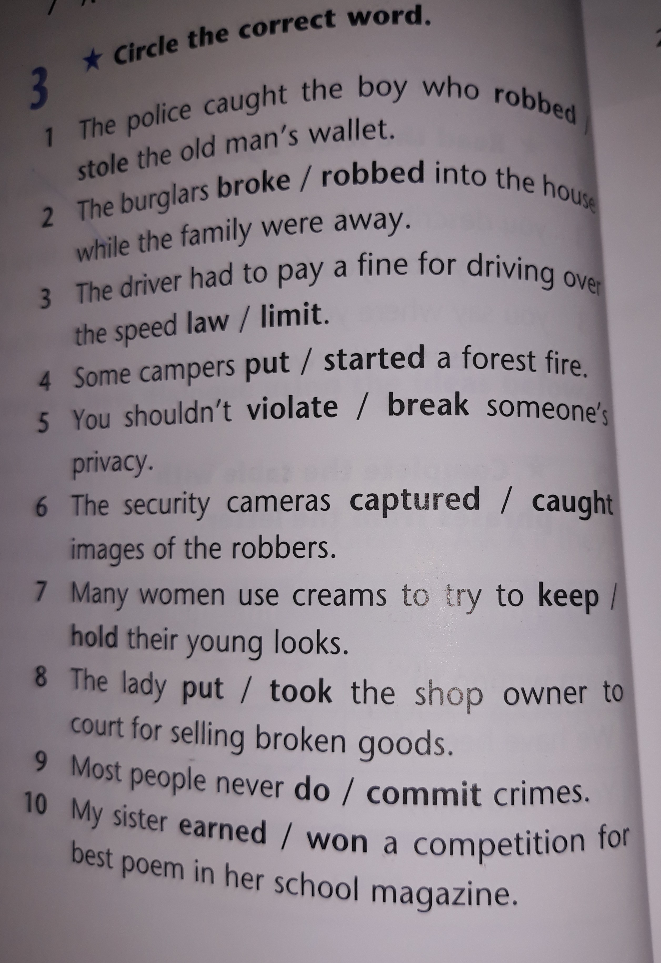 The police caught the boy who stole the old man’s wallet. The bulgars robbed into the house while the family were away. The driver had to pay a fine for driving over the speed limit. Some campers started a forest fire. You shouldn’t break someone’s privacy. The security cameras caught images of the robbers. Many women use creams to try to keep their young looks. The lady took the shop owner to court for selling broken goods. Most people never do crimes. My sister earned a competition for best poem in her school magazine.