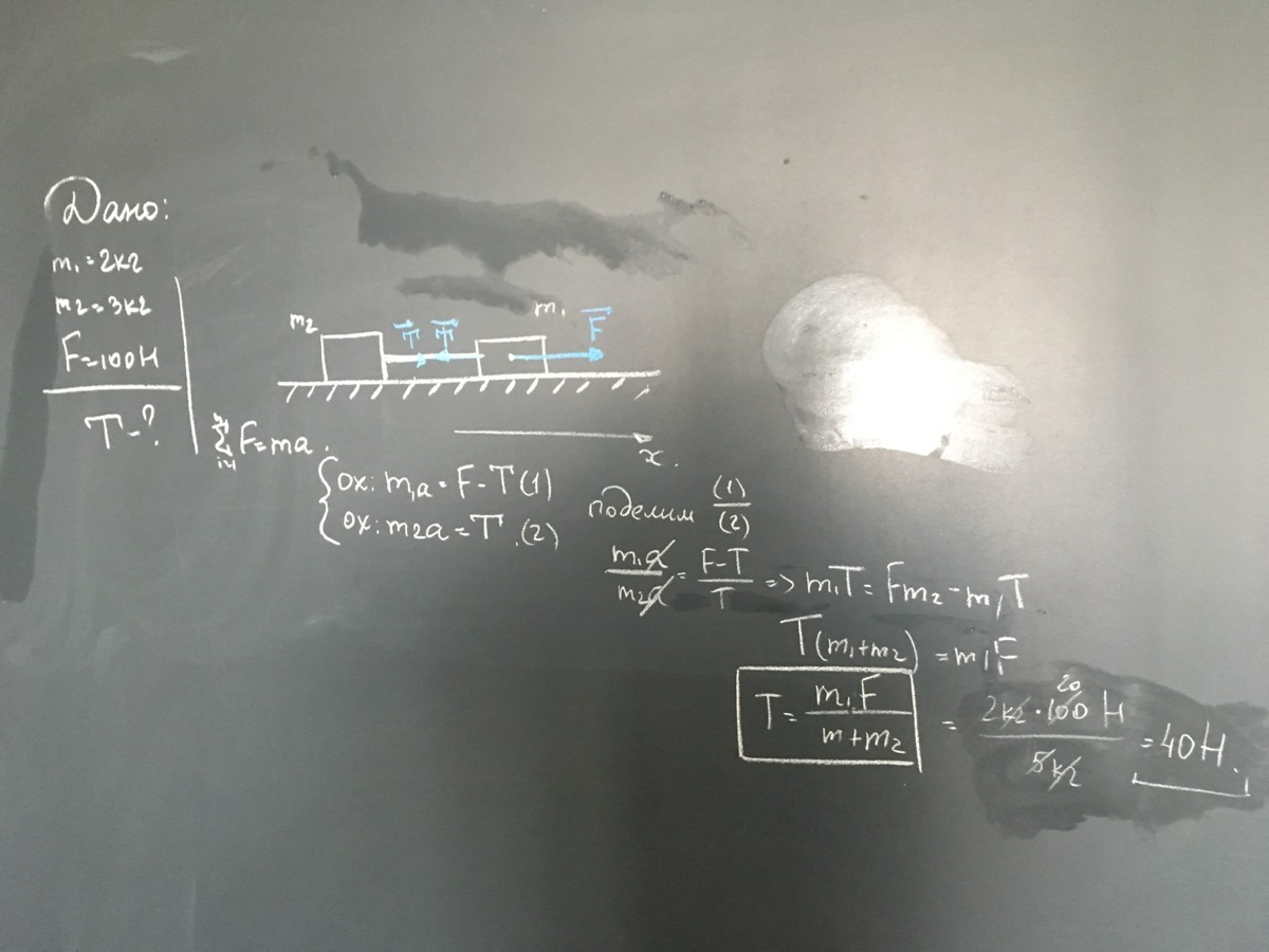помогите пожалуюста!!!. На горизонтальном гладком столе находятся два груза массами 2кг и 3кг, связанные прочной нитью. Малый груз тянут горизонтально силой 100 Н. Чему равна сила натяжения нити между грузами?