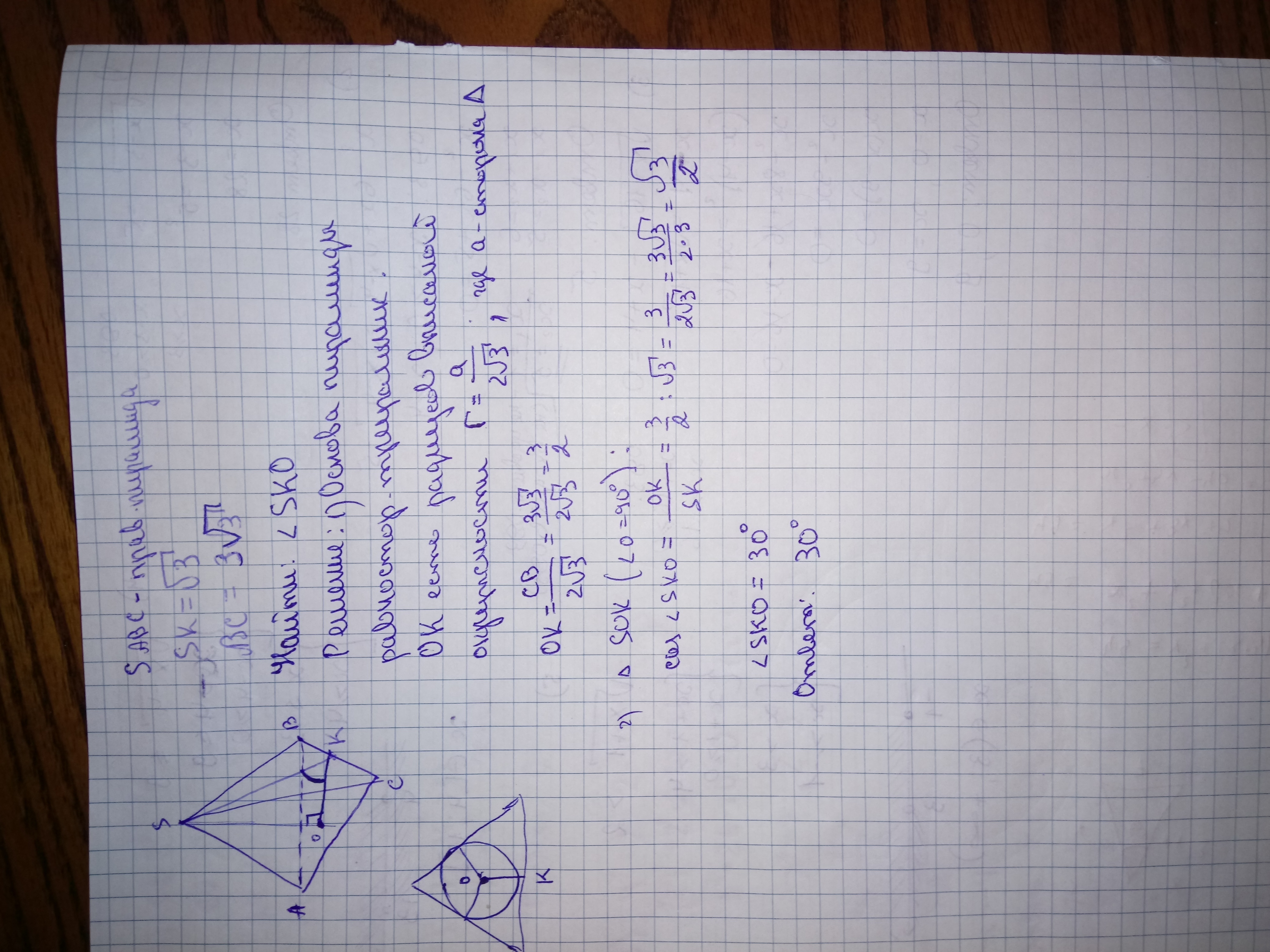 Апофема правильной треугольной пирамиды равна корень из 3, а сторона основания пирамиды равна 3 корней из 3. найдите угол между плоскостью боковой грани пирамиды и плоскостью ее основания