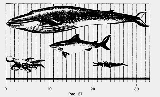 Найдите длину каждого животного по рисунку 27. На сколько метров кит длинее акулы? На сколько метров крокодил короче осьминога?Одно деление шкалы-1 м.