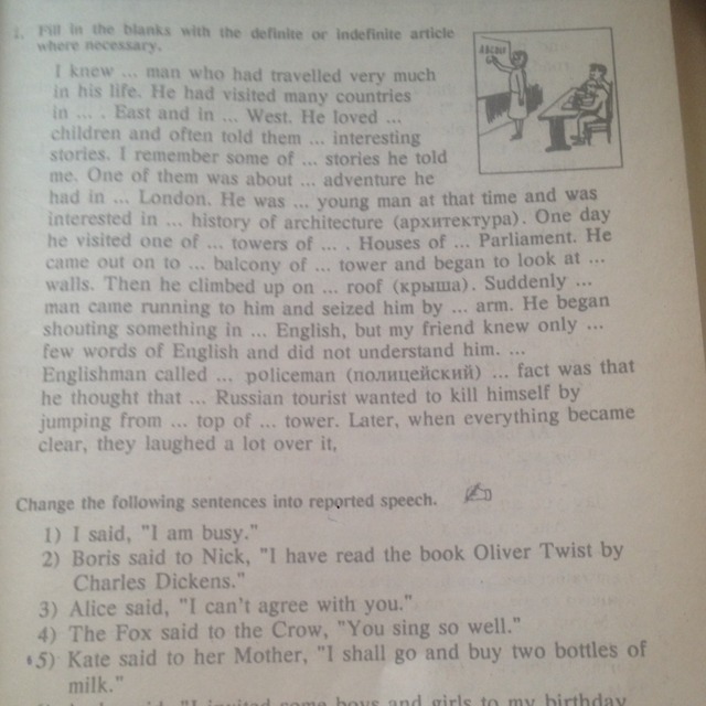 I knew a man who had travelled very much in his life. He had visited many countries in the east and in the west. He loved children and often told them interesting stories. I remember some of the stories which he told me. One of the stories was about an adventure he had had in London. He was a young man at that time and was interested in the history of architecture. One day he visited one of the towers of the Houses of Parliament. He came out on to the balcony of the tower and began to look at the ornaments on the walls. Then he climbed up on the roof. Suddenly a man came running to him and seized him by the arm. He began shouting something in English, but my friend knew only a few words of English and did not understand him. The Englishman called a policeman. The fact was that he thought that the Russian tourist wanted to kill himself by jumping from the top of the tower. Later, when everything became clear, they laughed a lot over it.