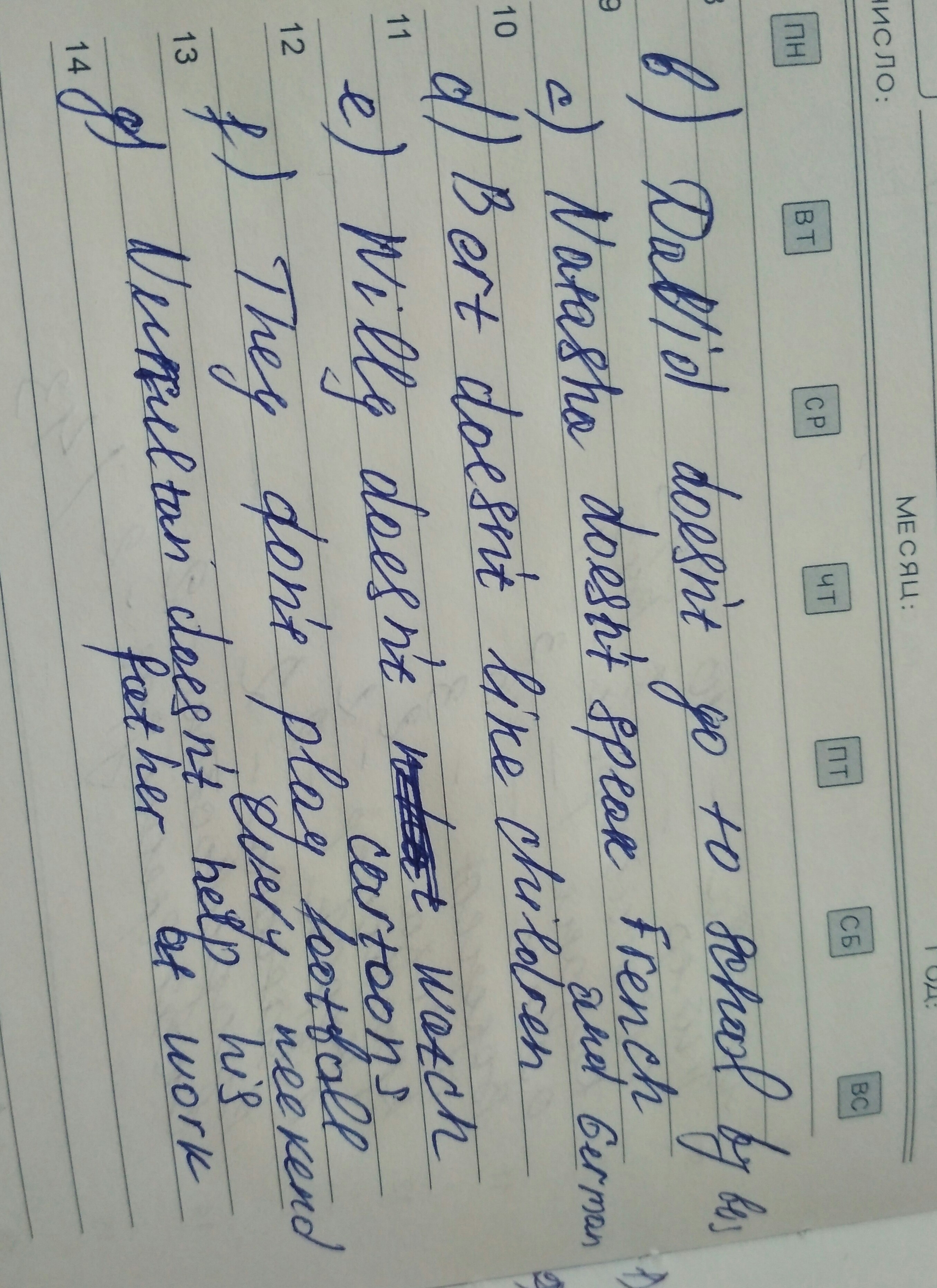 2. David doesn't go to school by bus.