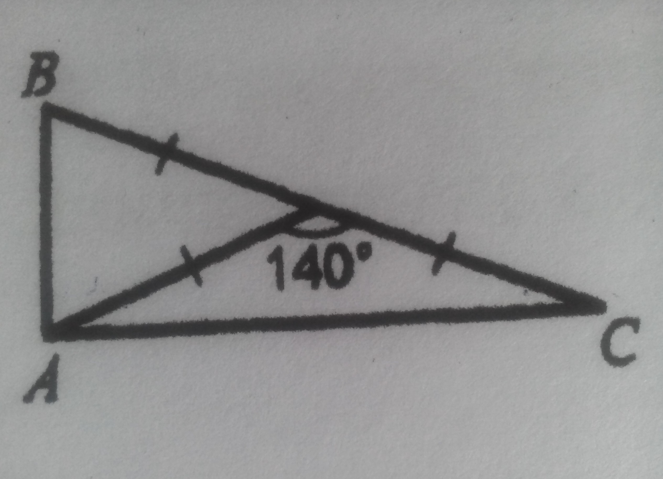 Дано:ΔАВС;∠АЕС=140(сам назвал так угол,можешь сам как угодно назвать).АЕ=ЕС;АЕ=ЕВ.Найти:∠А;∠В;∠С.Решение:Так как АЕ=ЕС,то ΔАЕС-равнобедренный;∠ЕАС=∠ЕСА (свойство равнобедренного треугольника)⇒(180-140):2=20.∠ЕАС=20°;∠ЕСА=20°Рассмотрим треугольник АЕВ.АЕ=ЕВ⇒ΔАЕВ-равнобедренный.∠ВЕА=40°(Смежный угол);∠ВАЕ=∠АВЕ=(180-40):2=70°⇒∠А=90°(70+20);∠В=70°;∠С=20°