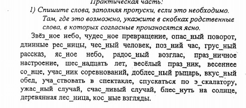 Звёздное(Звезда), чудесное(чудеса), опасный(опасен), ресницы, честный(честь), поздний(опоздать), грустный(грусть), ясное(ясен), радостный(радость), праздничное(празден), шестнадцать(шесть), праздник(празден), солнце(солнечный), участник(участие), доблестный(доблесть), вкусный(вкус), участвовать(участие), эскалатору, ужасный(ужас), счастливый(счастье), блеснуть(блеск), лестница, косные(косо).