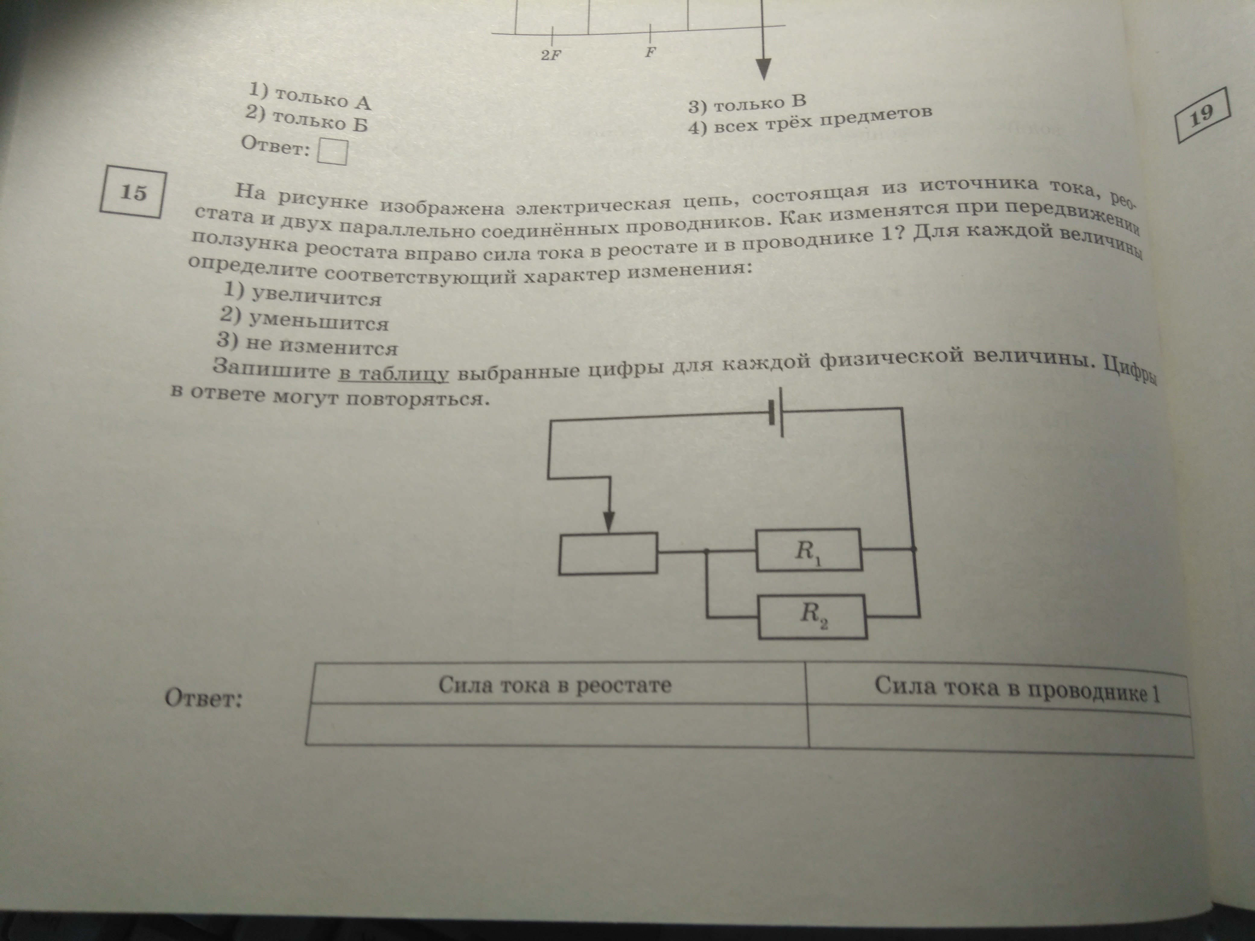 На рисунке изображена электрическая цепь, состоящая из источника тока, реостата и двух параллельно соединённых проводников. Как изменятся при передвижении ползунка реостата вправо сила тока в реостате и проводнике 1?