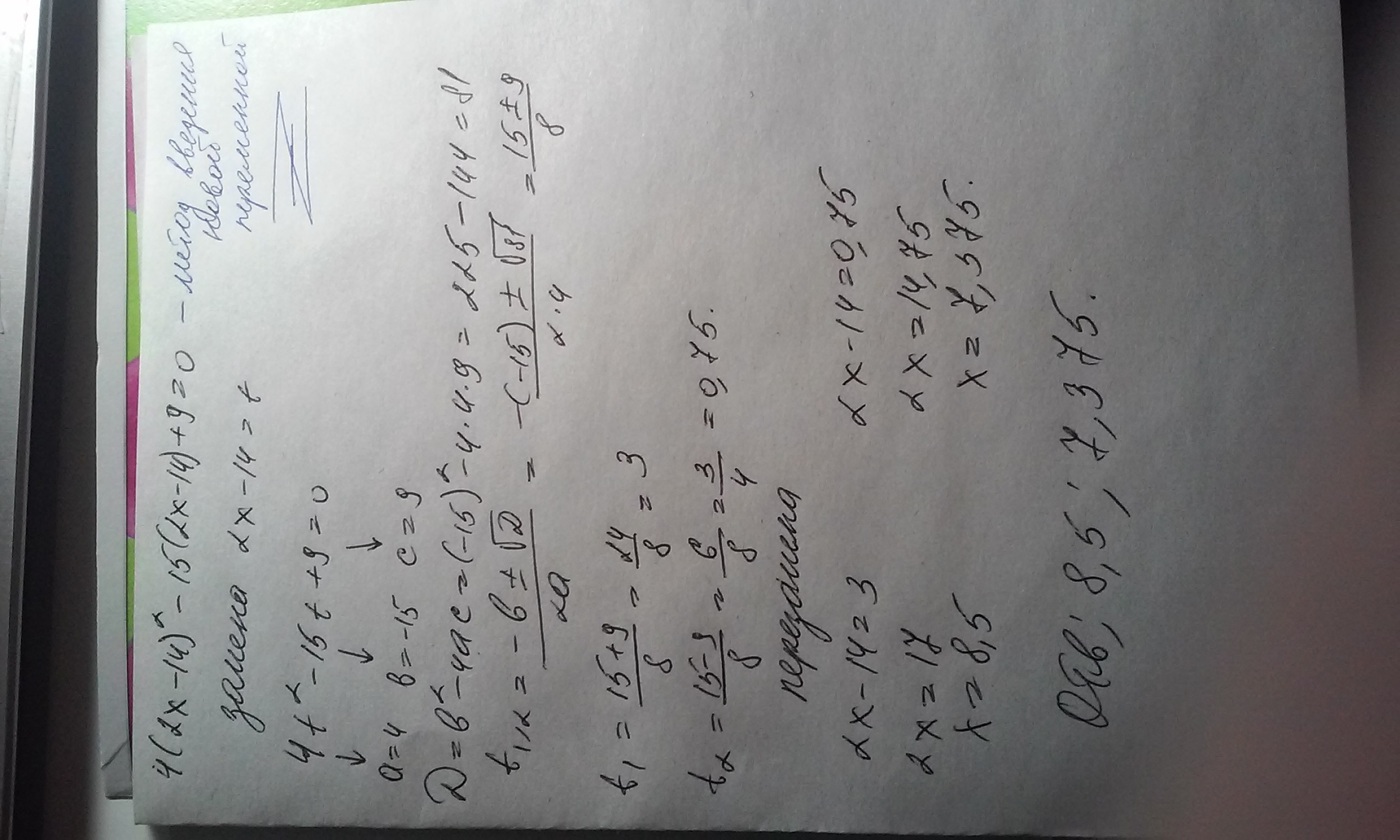 Реши квадратное уравнение 4(2x−14)^2−15(2x−14)+9=0