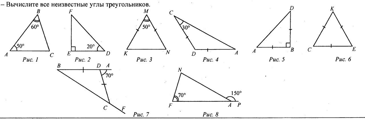 рис. 1 - угол АСВ=70°, рис.2 - угол EFD=70°, рис.3 - угол MKN и KNM= 130°, рис.4 - DAC=30° и угол CDA=120°, рис.5 - DAB и ADB=45°, рис. 6 - все углы равны 60°, рис.7 - ABC и BCA=35°, рис.8 - FNA=80° и FAN=30°.