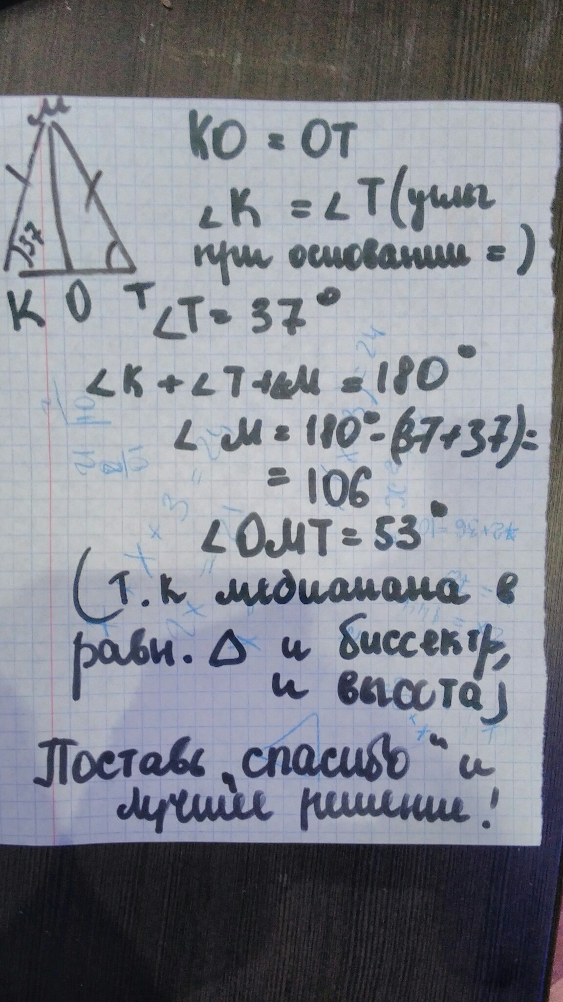 В равнобедренном треугольнике КМТ с основанием КТ угол К равен 37°. Найдите угол ТМО, где МО – высота треугольника.