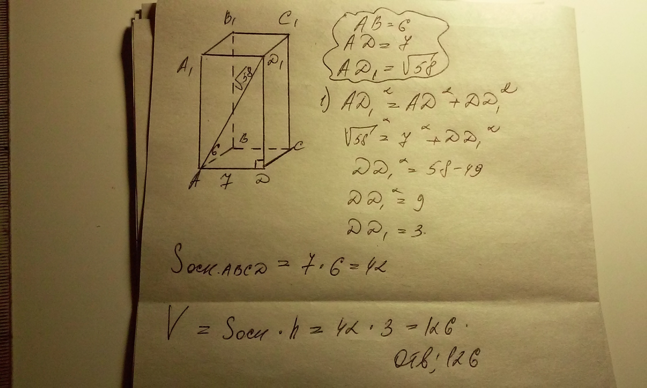 В прямоугольном параллелепипеде АВСДА1В1С1Д1 известны АВ=6,АД=7идиагональ боковой грани АД1=кваратный корень из 58.Найлите объем параллелепипеда АВСДА1В1С1Д1