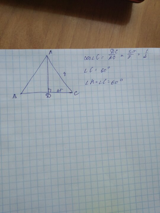 в равнобедренном треугольнике abc с основанием вс проведена высота ad. Найдите величины углов В и С, ЕСЛИ БОКОВАЯ СТОРОНА треугольника АС=7 см, а СD=3.5