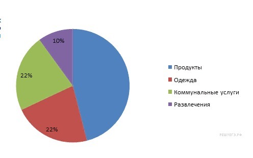 22+10+22=54%-складываем известные нам проценты из диаграммы. 100-54=46%-потрачено на продукты. =50000 рублей - всего потрачено денег.
