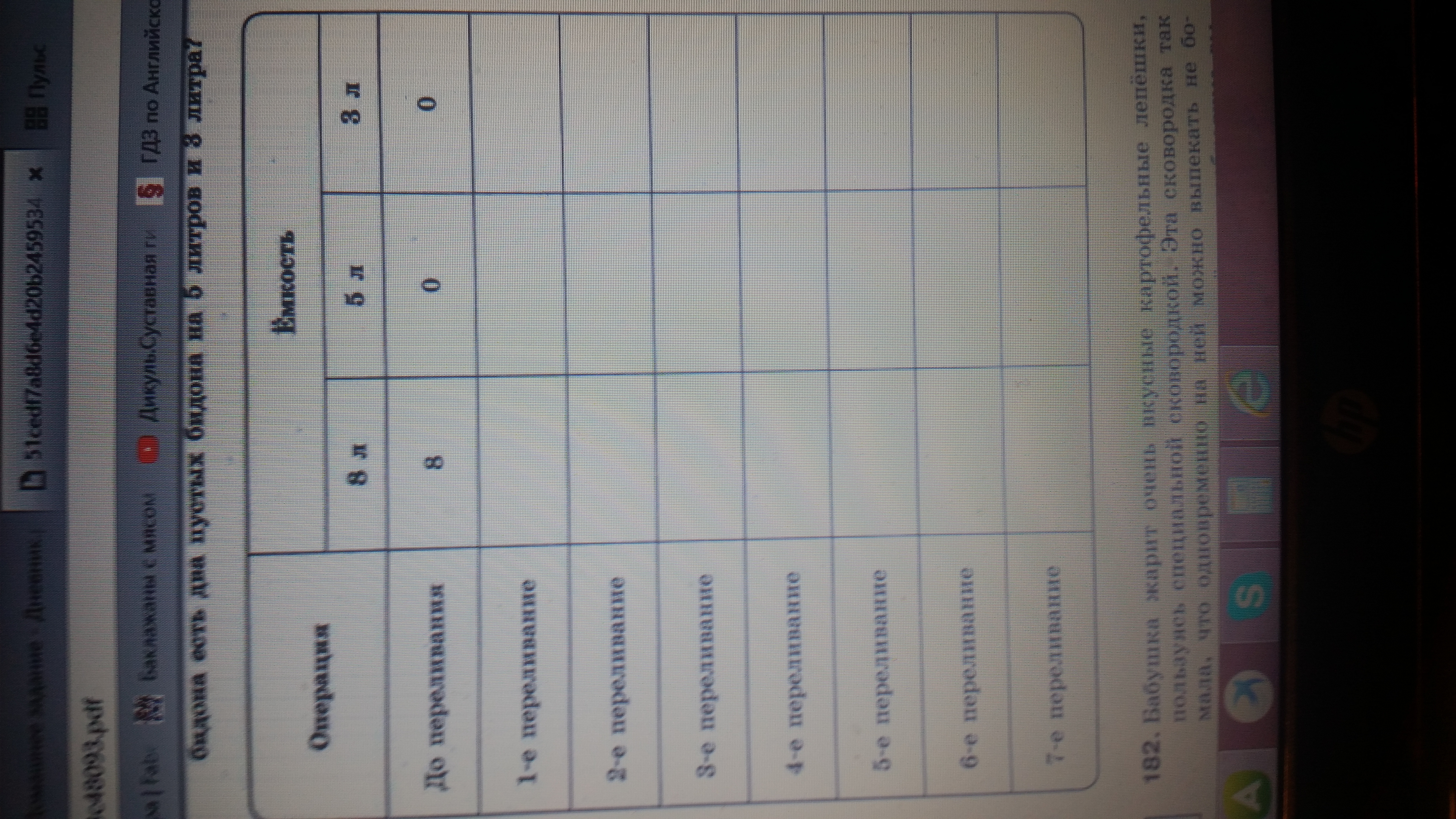 Как разделить 8 литров подсолнечного масла на 2 равные части по 4 литра если кроме полного 8 литрового бидона есть два пустых бидона на 5 литров и 3 лира?