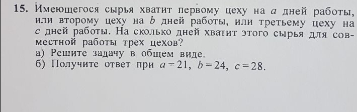 1/а+1/b+1/с=(bc+ac+ab)/abc - делают три цеха за 1 день