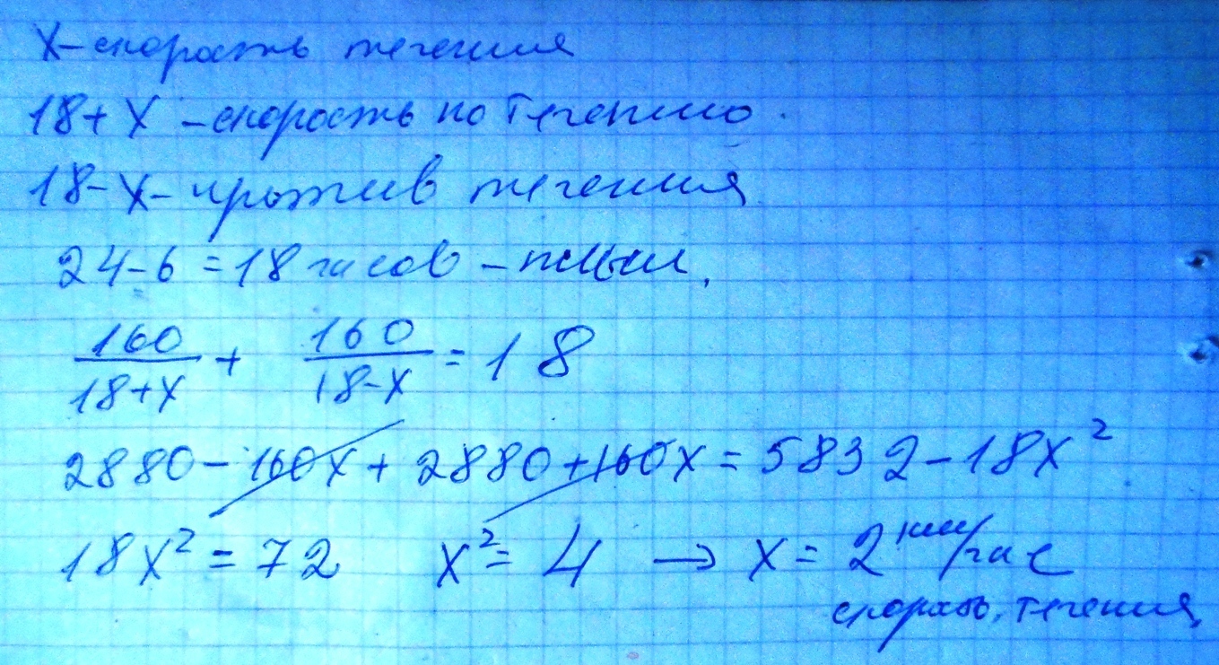 Теплоход проходит по течению до пункта назначения 160 км и после стоянки возвращается в пункт назначения.Найдите скорость течения если скорость теплохода в неподвижной воде равна 18км/ч,стоянка длилась 6 часов,а в пункт отправления теплоход возвращается ровно через сутки после отплытия из него.Ответ дайте в км/ч.